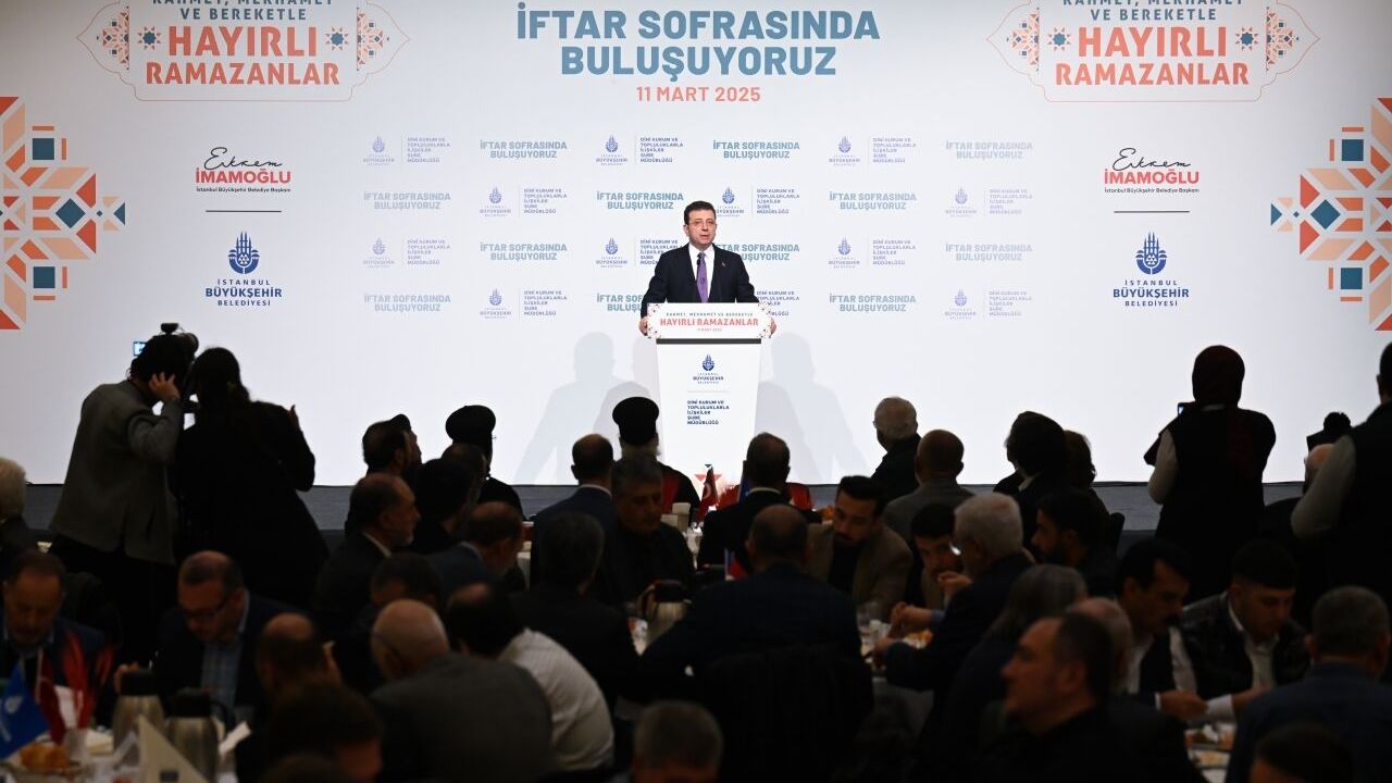 Şişli'deki İstanbul Kongre Merkezi Emirgan Salonu'nda düzenlenen iftar programında konuşan İBB Başkanı Ekrem İmamoğlu, ramazanın İslam alemine ve insanlığa barış, huzur ve bereket getirmesini Allah'tan niyaz etti.