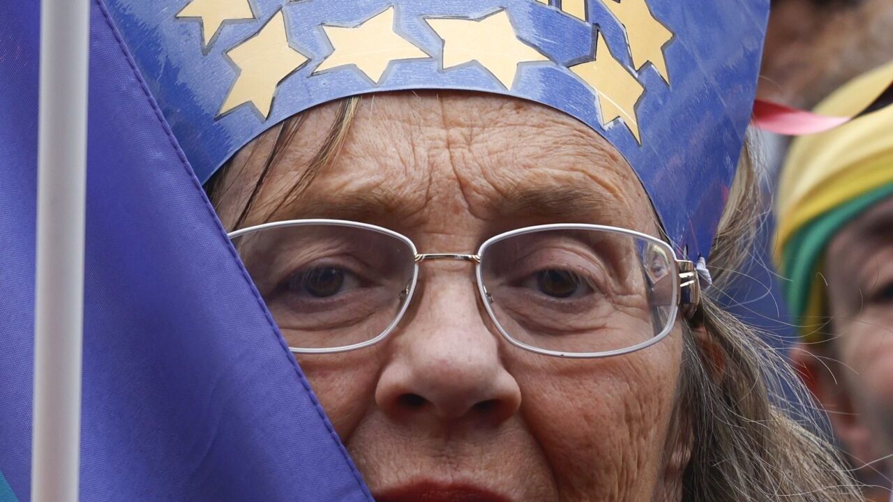 Miting meydanında, AB'ye yönelik yaklaşımından dolayı ABD Başkanı Donald Trump'a tepki gösterilen dövizler açıldı.