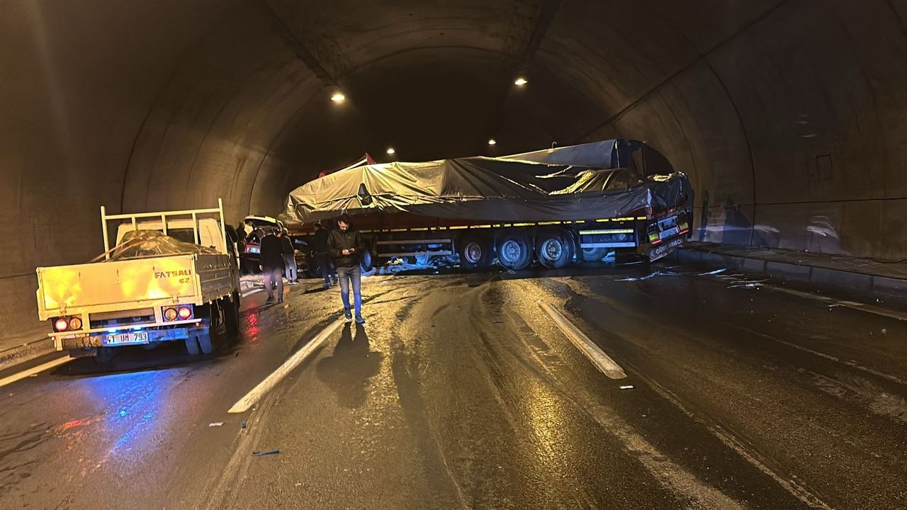 Alınan bilgiye göre, tünelde 2 otomobil, 2 tır ve 1 yolcu otobüsünün karıştığı zincirleme kaza meydana geldi.