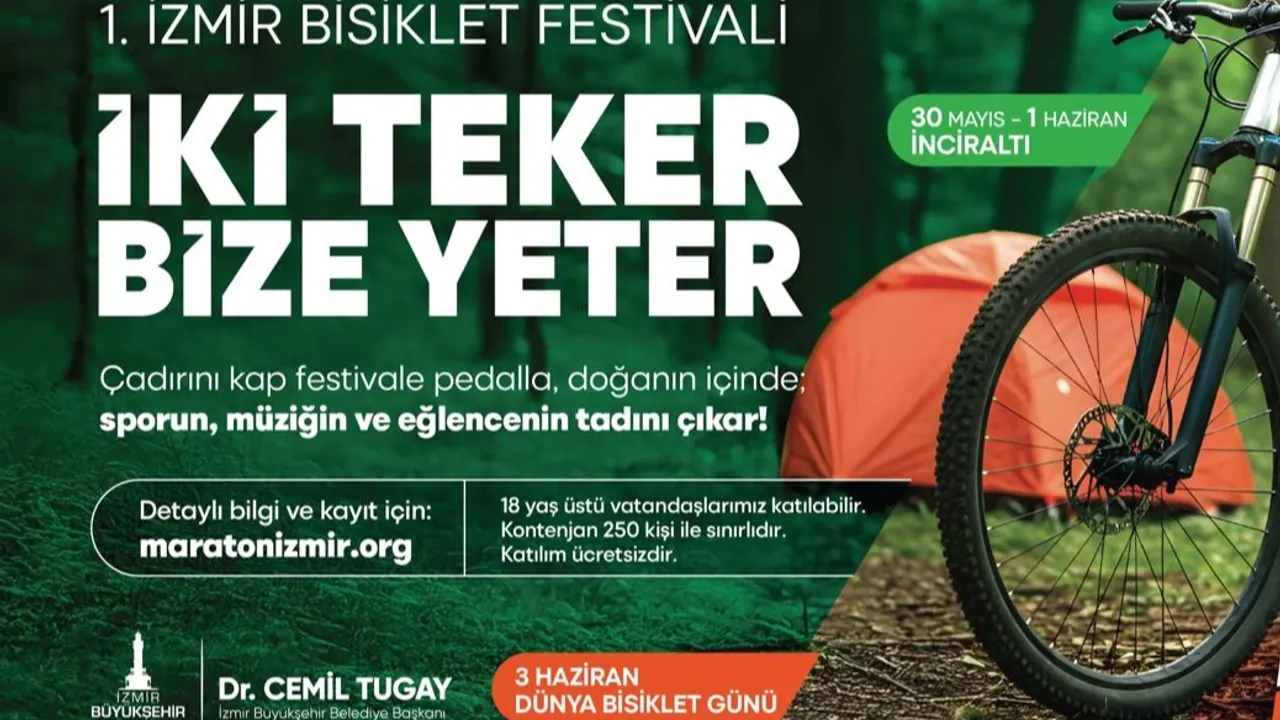 İzmir Büyükşehir Belediyesi, 3 Haziran Dünya Bisiklet Günü etkinlikleri kapsamında 1. İzmir Bisiklet Festivali düzenleyecek.İZMİR (İGFA) - İzmir'de bisikletseverler 30 Mayıs – 1 Haziran tarihleri arasında İnciraltı Spor Tesisleri’nde kurulacak kamp alanına çadırlarını ve bisikletlerini getirerek müzik ve spor eşliğinde keyifli vakit geçirecek.