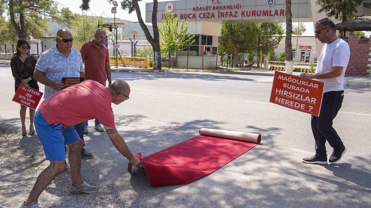 İZMİR (AA) - İzmir Büyükşehir Belediyesinin başlattığı konut projeleri ilerlemediği için evlerine kavuşamayan hak sahipleri, CHP Genel Başkanı Özgür Özel'in 25 Ağustos'taki açıklamalarına tepki amacıyla cezaevi önünde kırmızı halı serdi.