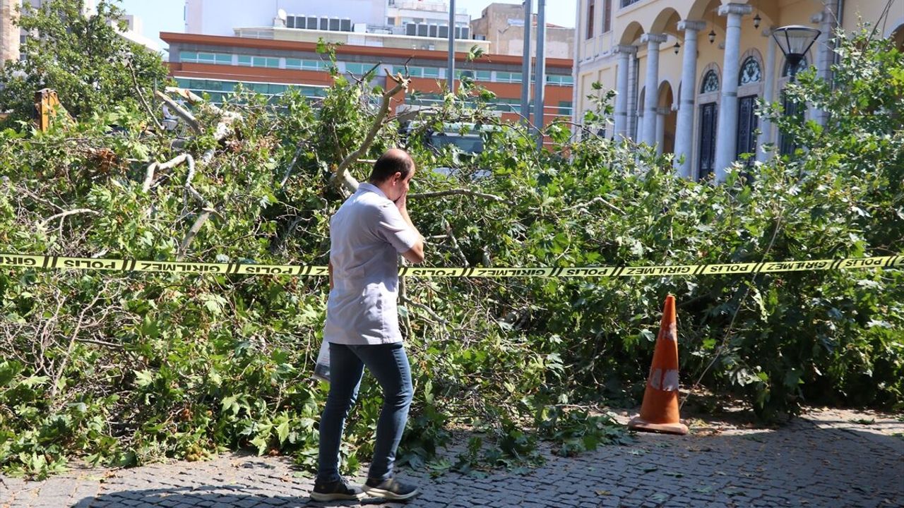 Kemeraltı Çarşısı'nın Konak Atatürk Meydanı'ndaki girişinde bulunan ağaç, bilinmeyen nedenle devrildi.