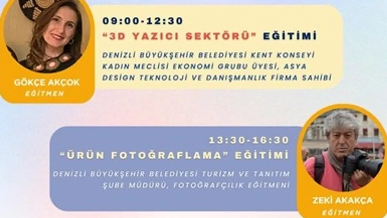 Kadın girişimciliğini desteklemeyi amaçlayan projenin 2. eğitimi, 18 Temmuz Cuma günü Denizli Büyükşehir Belediyesi Kongre ve Kültür Merkezi’nin S2 salonunda gerçekleştirilecek. Girişimci ve üretken kadınların dijital dünyada daha fazla yer almasını hedefleyen bu özel eğitim programı, “3D Yazıcı Sektörü” ve “Ürün Fotoğraflama” adlı iki ana başlıkta yapılacak.