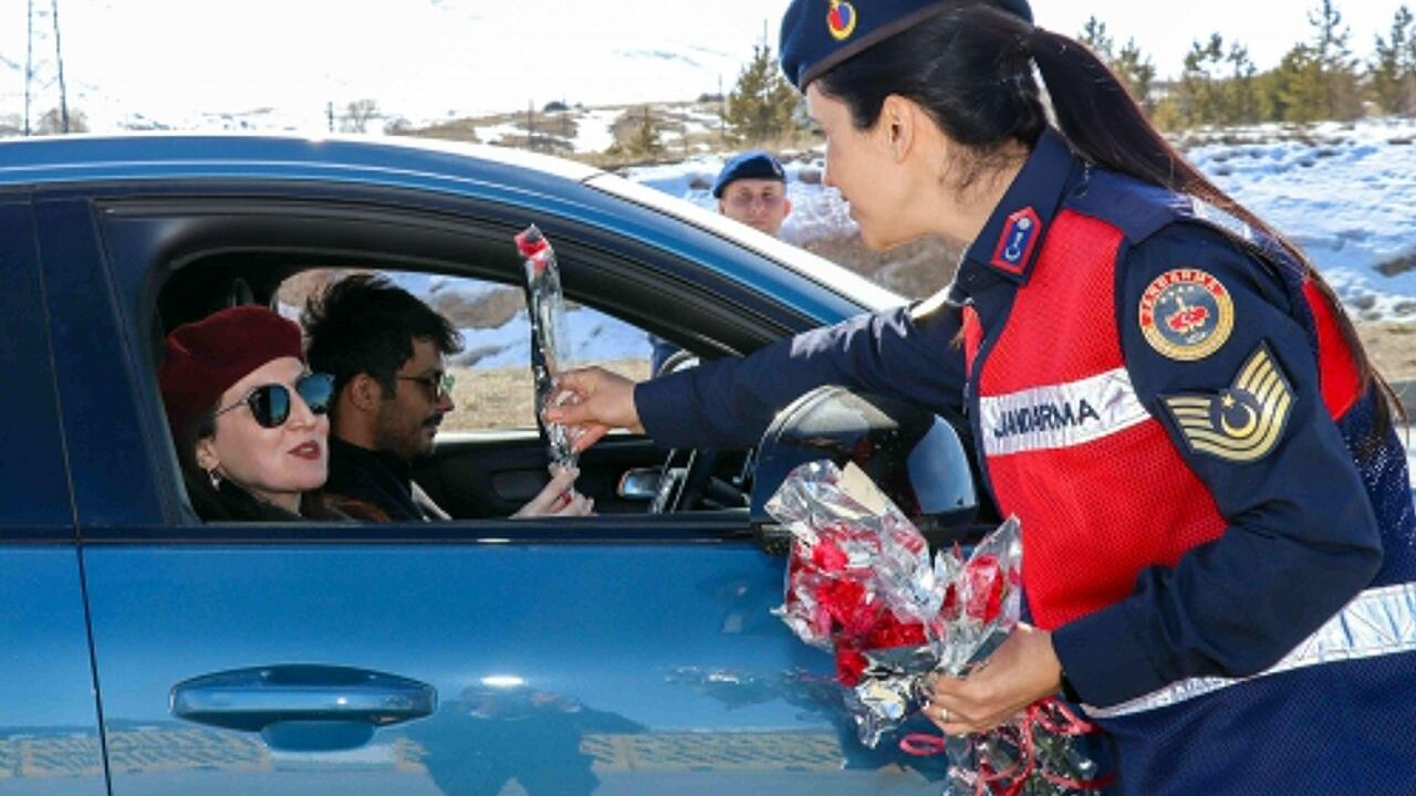 Kayseri Valiliğinden yapılan açıklamaya göre, İl Jandarma Komutanlığı Aile İçi Şiddetle Mücadele ve Çocuk Kısım Amirliği koordinesinde ekipler, 8 Mart Dünya Kadınlar Günü dolayısıyla Kayseri-Malatya kara yolu Pınarbaşı ilçesindeki yol kontrol noktasında durdurdukları araçlardaki kadınların gününü kutladı.