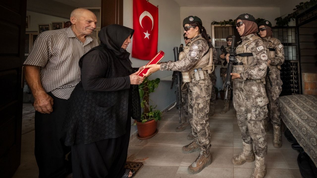 Ziyarete şehit Güngör'ün adının verildiği zırhlı araçla giden kadın özel harekat polisleri, anne Güngör'e Türk bayrağı ve özel harekat beresi verdi.