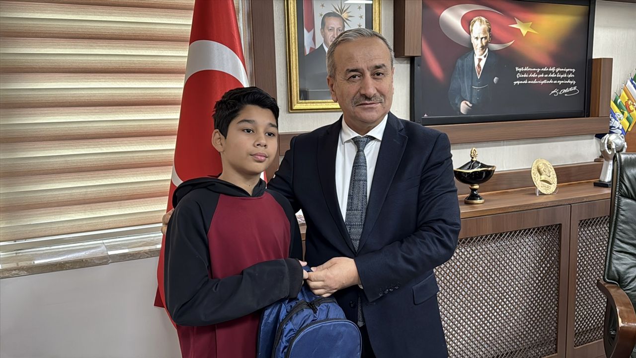 Gapurjanov'a içinde kitaplar ve kırtasiye malzemeleri bulunan çanta veren Akbaş, öğrenciyi tebrik etti.