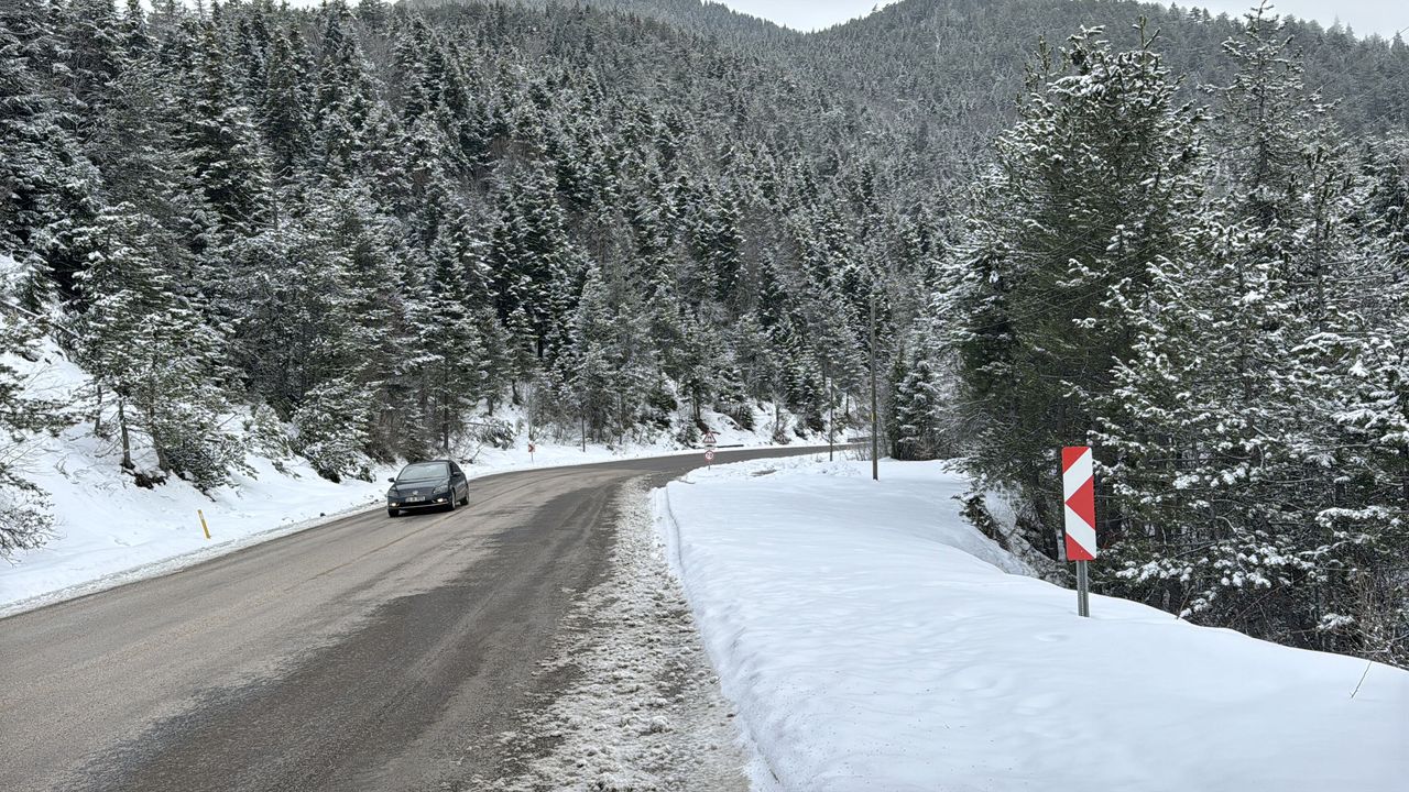 Karabük-Bartın kara yolunun 1030 rakımlı Ahmetusta Geçidi'nde yağışın ardından ormanlık alanlar beyaza büründü.