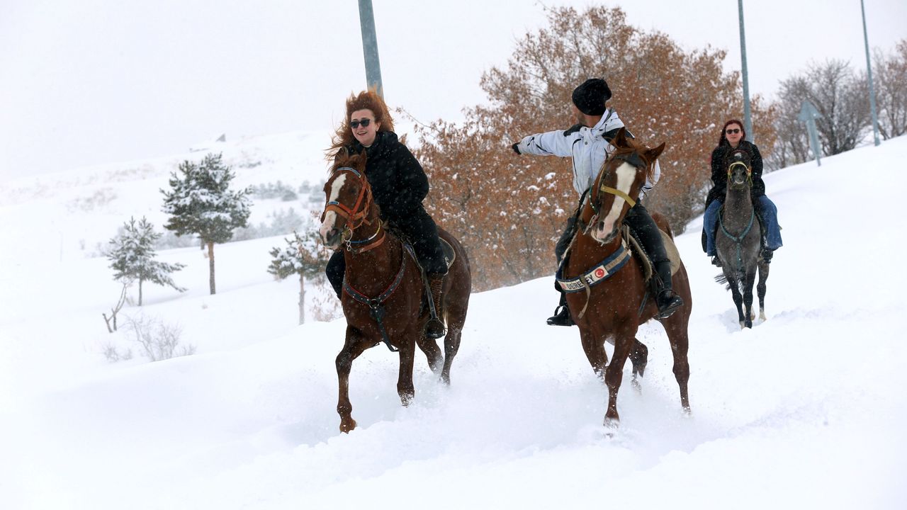 Kent merkezine 4 kilometre uzaklıkta ve içerisinde kahraman Türk kadını Nene Hatun'un kabrinin de bulunduğu tabyaların yer aldığı Nene Hatun Tarihi Milli Parkı'ndaki çiftlikten at kiralayan vatandaşlar, karla kaplı tarihi yapının çevresinde gezinti yapıyor.