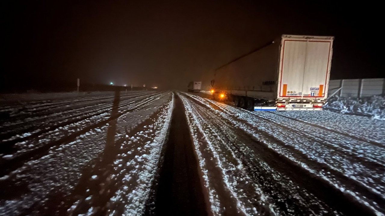 Kars-Ardahan kara yolu Mezra köyü mevkisinde yoğun kar ve tipi nedeniyle bazı tırlar yolda kaldı, bazıları ise makas attı.