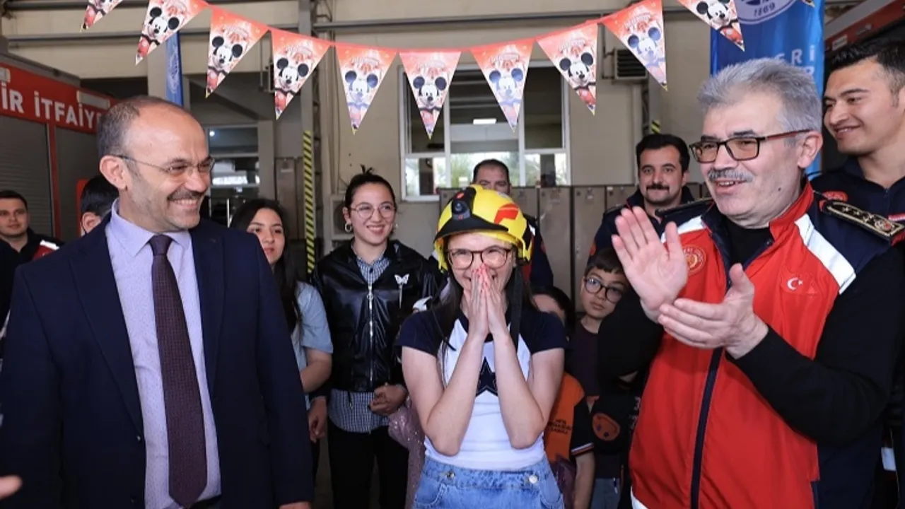 İtfaiye aracına binmenin kendisi için en büyük mutluluklardan biri olduğunu ifade ettiği anlarda, “Bugün için kutlamalar bekliyordum, çok mutluyum” diyen Aleyna, büyük bir heyecanla araçta yerini aldı.
