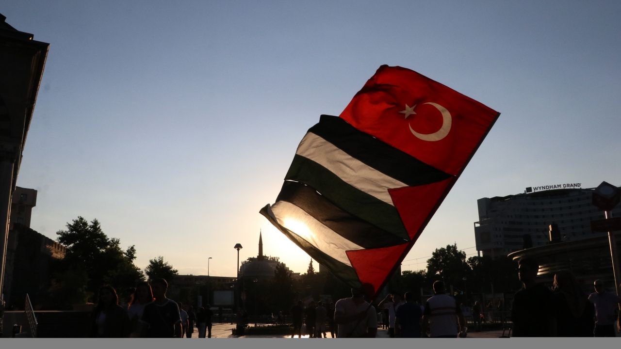 Cumhuriyet Meydanı'ndaki Bürüngüz Camisi önünde toplanan grup üyeleri, Türk ve Filistin bayrakları taşıdı.