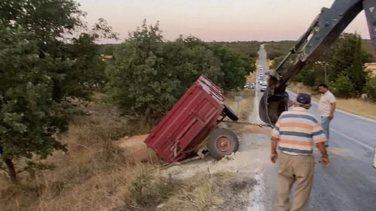 Olay yerine gelen kepçe ile devrilen römork kaldırıldı ve yola saçılan buğdaylar temizlenerek yol trafiğe açıldı.