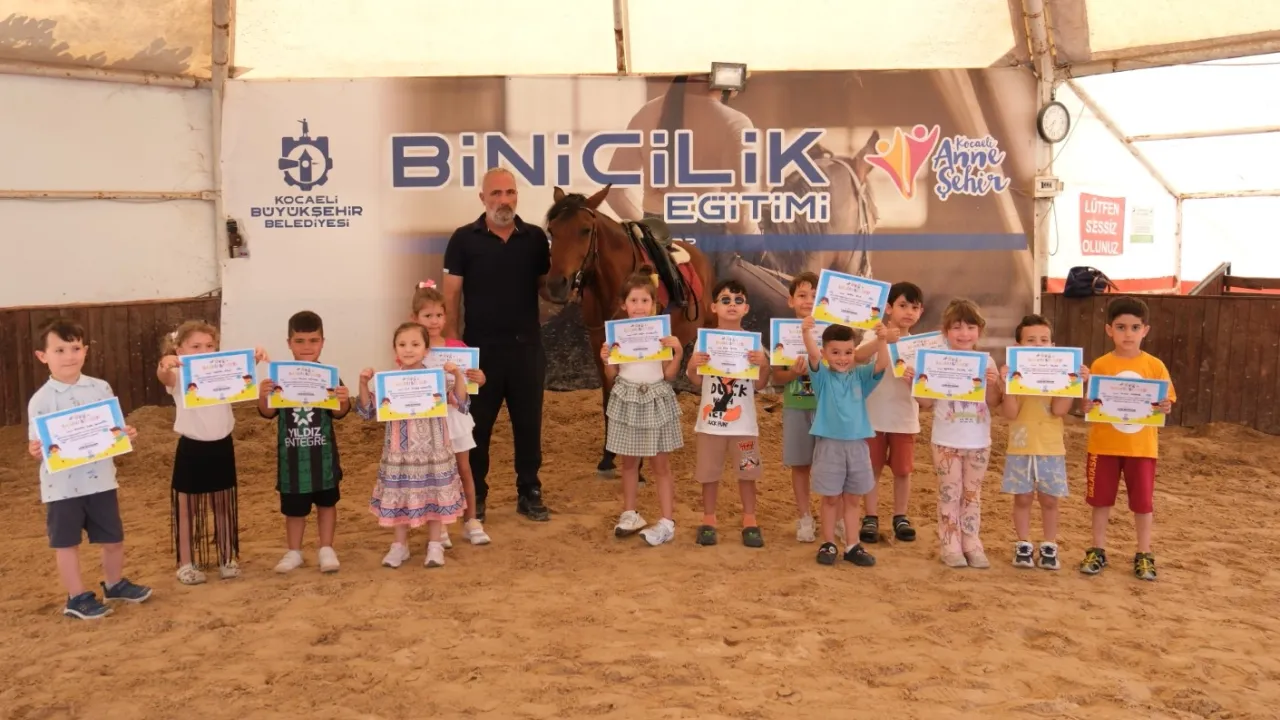 Kocaeli Büyükşehir Belediyesi’nin çocuklara at sevgisini kazandırmak amacıyla başlattığı ücretsiz binicilik eğitimleri kapsamında minik biniciler sertifikalarını aldı.KOCAELİ (İGFA) - Kocaeli Büyükşehir Belediyesi, çocuklara at sevgisi kazandırmak ve binicilik sporunu sevdirmek amacıyla başlattığı ücretsiz binicilik eğitimlerine devam ediyor. 4-6 yaş arası çocuklara yönelik düzenlenen “At Biniş Eğitimleri” kapsamında Haziran ayı eğitimlerini başarıyla tamamlayan 130 çocuk, düzenlenen törenle başarı sertifikalarını aldı.