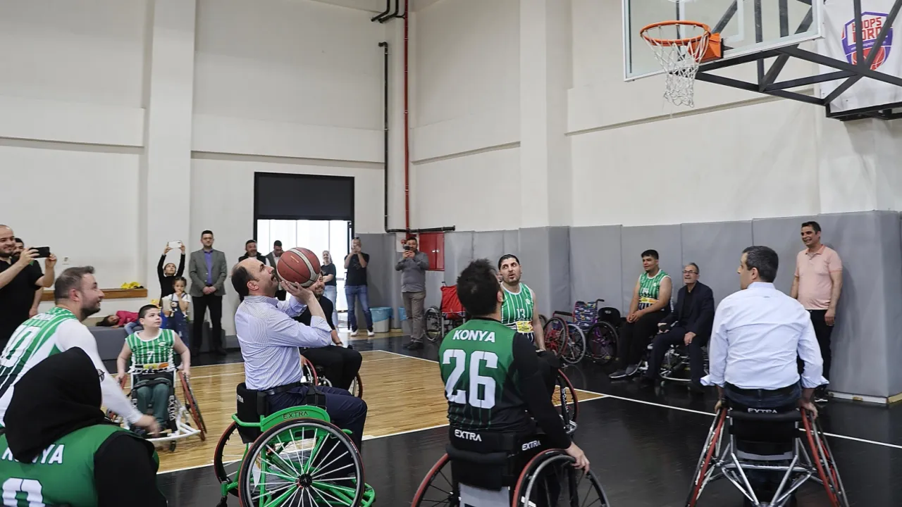 Konya Büyükşehir Belediyesi tarafından Konya Lisesi’ne kazandırılan spor salonunda gerçekleştirilen etkinlikte Konya Büyükşehir Belediye Başkanı Uğur İbrahim Altay, tekerlekli sandalyeye oturarak Konya Engelliler Spor Kulübü Tekerlekli Sandalye Basketbol Takımı sporcularıyla ile maç yaptı.