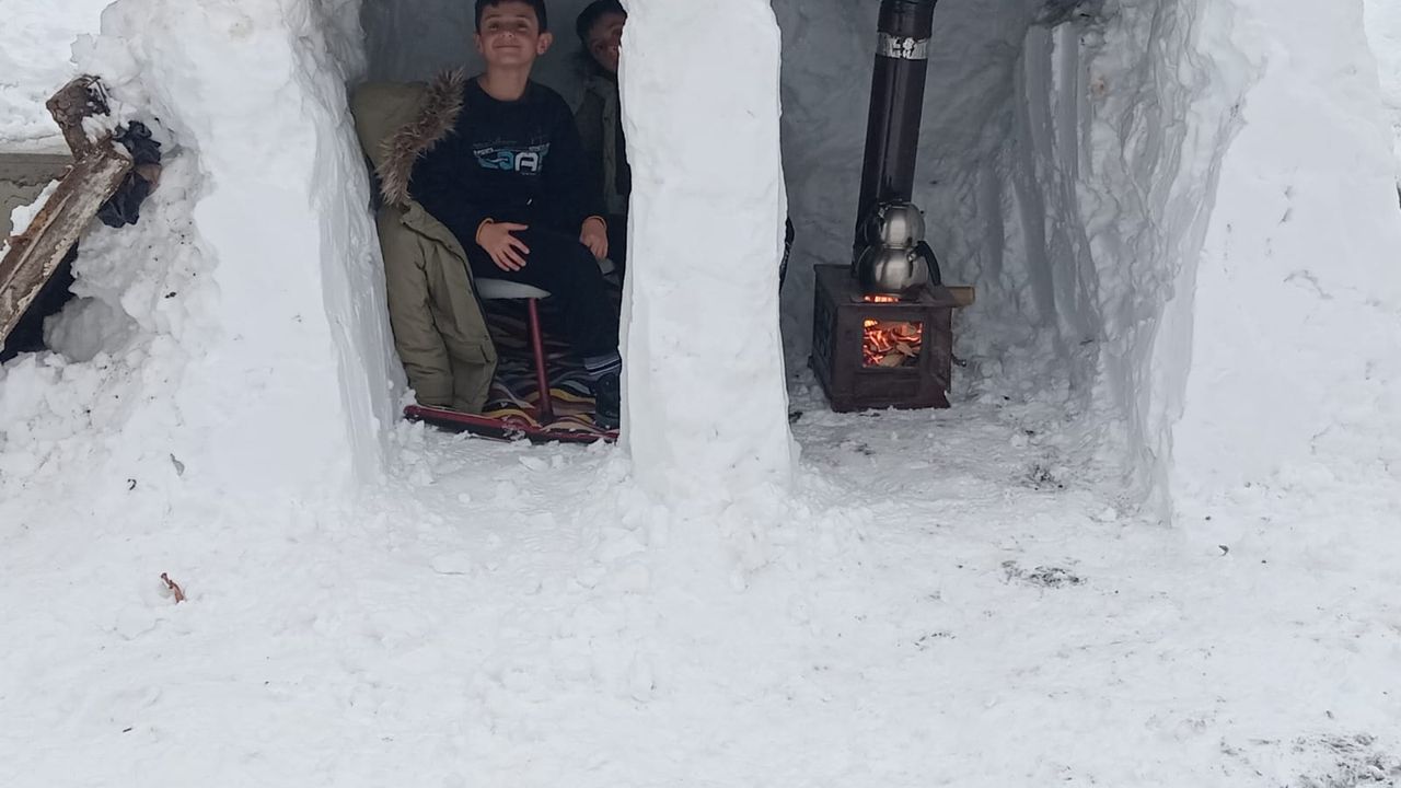 İlçe merkezindeki yağışın ardından Mesut Yaman, yarıyıl tatilindeki çocukları Yasir Faruk ve Muhammed Fatih için kardan ev yapmaya karar verdi. Yaman, yaptığı eve halı serip soba da kurdu.