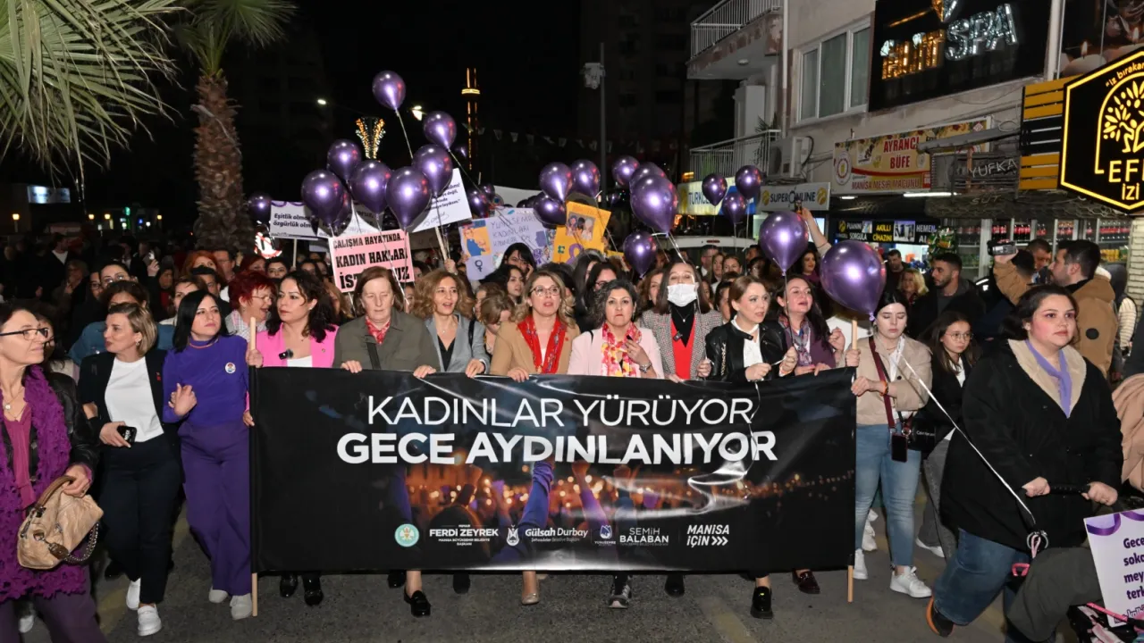 Manisa’da yüzlerce kadın, 8 Mart Dünya Kadınlar Günü’nde bir araya gelerek toplumsal cinsiyet eşitliği, özgürlük ve kadın hakları için seslerini yükseltti. ‘Kadınlar Yürüyor Gece Aydınlanıyor’ yürüyüşünde buluşan kadınlar, sloganlar atarak ve düdük çalarak kadına yönelik şiddete de tepki gösterdi.MANİSA (İGFA) - Manisa Büyükşehir Belediyesi, Şehzadeler Belediyesi ve Yunusemre Belediyesi iş birliğiyle ‘Kadınlar Yürüyor Gece Aydınlanıyor’ isimli gece yürüyüşü düzenlendi. Manisa Büyükşehir Belediyesi Kültür Merkezi önünden başlayan yürüyüş, 15 Temmuz Demokrasi Meydanı’nda son buldu.