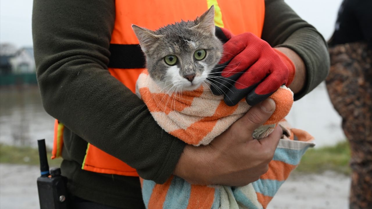 Nehrin taştığı Bosnaköy mevkisindeki ev ve çiftliklerde kedi ve köpekleri mahsur kalan vatandaşlar, AFAD ekiplerinden yardım istedi.