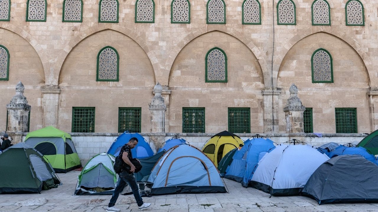 Ramazan ayının son 10 günündeyse, Filistinliler ve dünyanın dört bir yanından gelen Müslümanlar, Mescid-i Aksa'da çadırlar kurarak itikafa girdi.