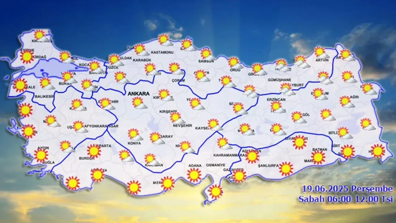 Meteoroloji Genel Müdürlüğü'nün raporuna göre, kuzeydoğu bölgeler parçalı bulutlu, Trabzon ve Rize'de yerel yağış bekleniyor. Diğer yerler az bulutlu ve açık. Hava sıcaklıkları mevsim normallerinin üstünde, kuzeyden esen rüzgar hafif.ANKARA (İGFA) - Meteoroloji Genel Müdürlüğü 19 Haziran Perşembe gününe ilişkin hava tahmin raporunu yayımladı. Buna göre ülkemizin kuzeydoğu kesimlerinin parçalı, yer yer çok bulutlu; Trabzon ve Rize’nin iç kesimlerinin yerel olmak üzere sağanak yağışlı, diğer yerlerin az bulutlu ve açık geçeceği tahmin edildi.