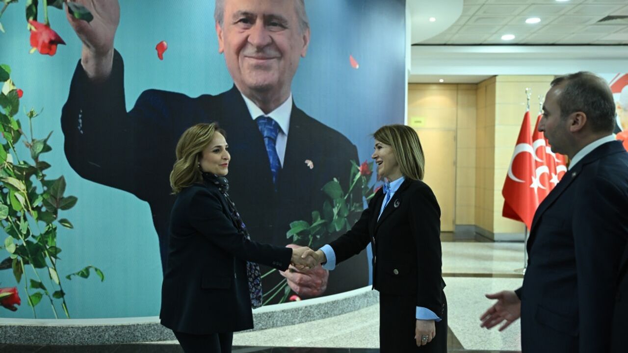 Bayramlaşmak için MHP Genel Merkezi'ne gelen DEM Parti heyetini, Genel Başkan Yardımcısı Zühal Topcu, Siyaset ve Liderlik Okulu Koordinatörü MYK üyesi Turan Şahin, MYK üyesi Özmen Alp Giray Erdemir'den oluşan heyet ağırladı.