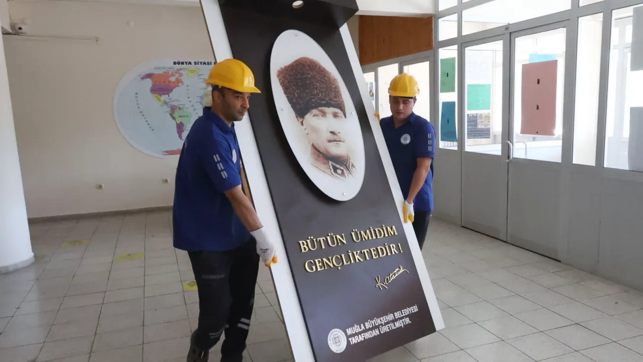 Muğla Büyükşehir Belediyesi, il genelinde gelen talepler doğrultusunda bakım onarım çalışmalarına ve Atatürk büstü ile Atatürk köşesi yapımına devam ediyor.MUĞLA (İGFA) - Muğla Büyükşehir Belediyesi, İl Milli Eğitim Müdürlüğü ile koordineli olarak, öğrencilerin daha güvenli, sağlıklı ve konforlu ortamlarda eğitim alabilmesi için 2025-2026 eğitim öğretim yılı öncesinde bakım ve onarım çalışmalarına başladı. Çocuklarda tarih bilinci ve milli kimlik duygusunu pekiştirmek amacıyla Atatürk büstü ile Atatürk köşesi çalışmaları da gerçekleştiriliyor.