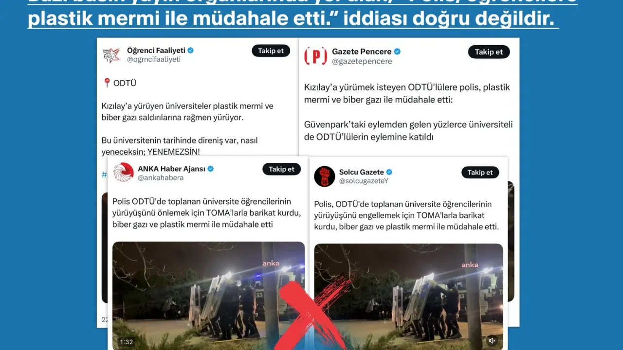 Bazı basın yayın organlarında yer alan, polisin Kızılay'a yürümek isteyen ODTÜ'lülere plastik mermi ile müdahale ettiği yönündeki iddianın dezenformasyon olduğu açıklandı.ANKARA (İGFA) - Polisin, göstericilere plastik mermi ile müdahale ettiği iddiasına ilişkin açıklama İletişim Başkanlığı'ndan geldi.