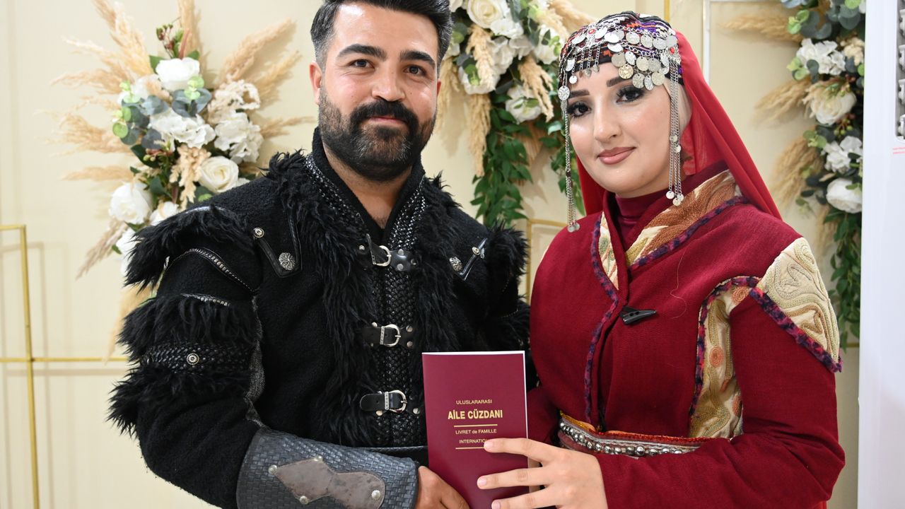 Genç çift, nikah masasına gelinlik ve damatlık yerine geleneksel kıyafetlerle oturdu.