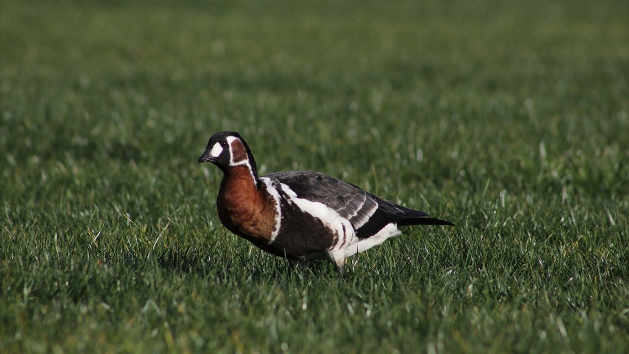 Kahverengi, siyah ve beyaz renkteki tüyleriyle dikkat çekici bir görünüme sahip Sibirya kazı, sahil kesimindeki yeşil alanda gözlemlendi.