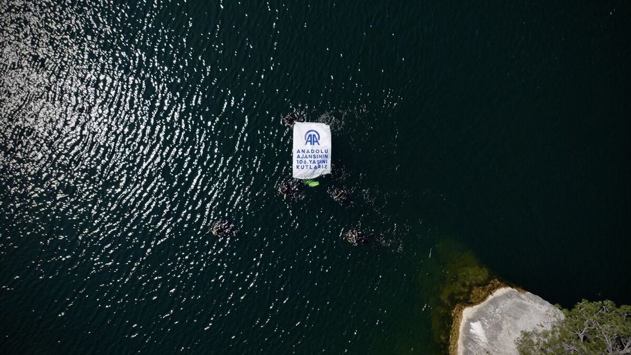 Su sıcaklığının 6 derece olduğu bölgede 17 metre derine inen dalgıçlar, burada 3 metre uzunluğundaki 'Anadolu Ajansının 106. yılını kutlarız' pankartını açtı.