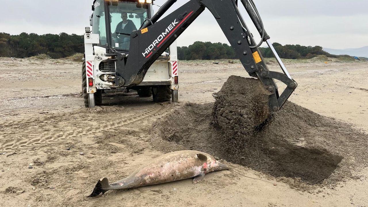 İncelemelerin ardından Alaçam Belediyesi ekipleri, kepçe yardımıyla yunusu sahilde uygun bir alana gömdü.