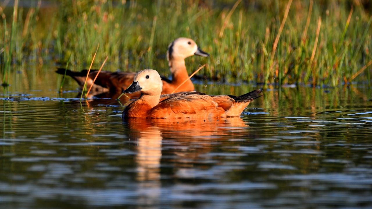 Göletlerde besin arayan angutlar ile farklı türlerden yaban kuşları, objektife yansıdı.