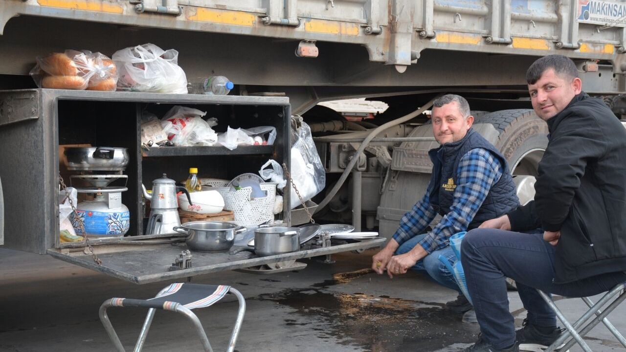 Şoförler, iftar saatinin yaklaşmasıyla marketten temin ettikleri ve tırlarının dorselerindeki dolaplarda bulunan malzemelerle yemek hazırlamaya başlıyor.
