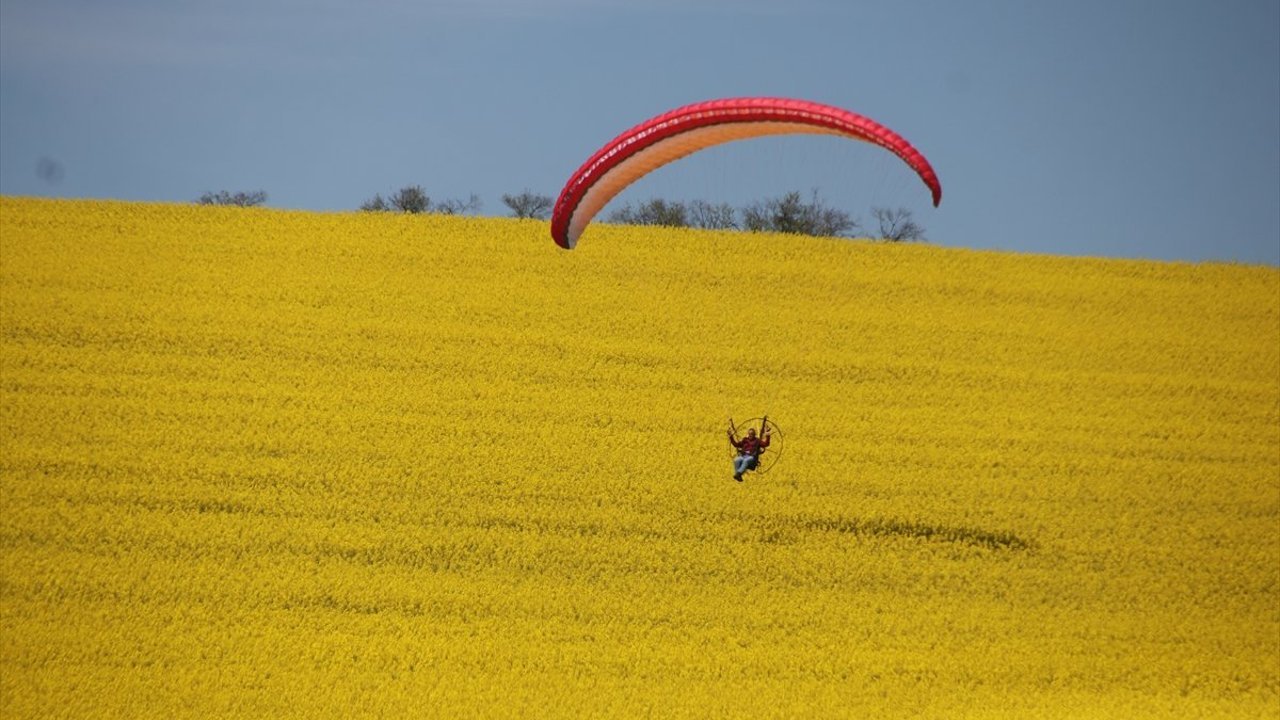 TEKİRDAĞ (AA) - Tekirdağ'da yaşayan paraşüt eğitmeni Kadir Aksoy, kanola tarlası üzerinde paramotorla uçuş gerçekleştirdi.