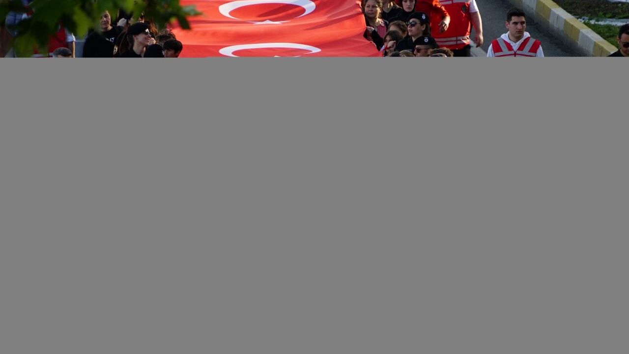 Katılımcılar, 200 metrelik Türk bayrağıyla Atatürk Caddesi'nden Barış ve Özgürlük Parkı'na yürüdü.