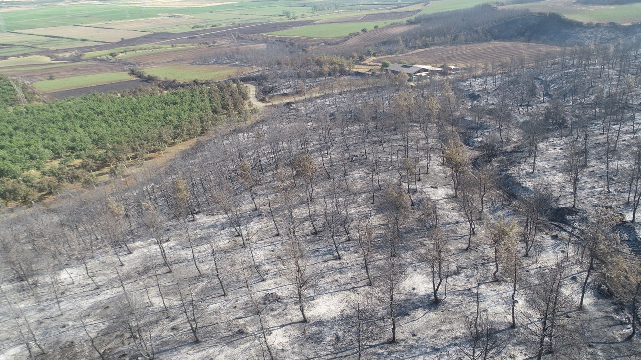 ÇANAKKALE (AA) - Tekirdağ'ın Şarköy ilçesinde çıkan ve Çanakkale'nin Gelibolu ilçesine sıçrayan orman yangınında zarar gören alanlar dronla görüntülendi.