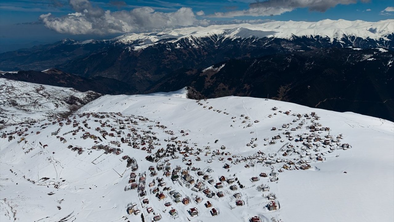 Karla kaplı yayla evleri ve yaylanın zirveleri dronla kaydedildi.