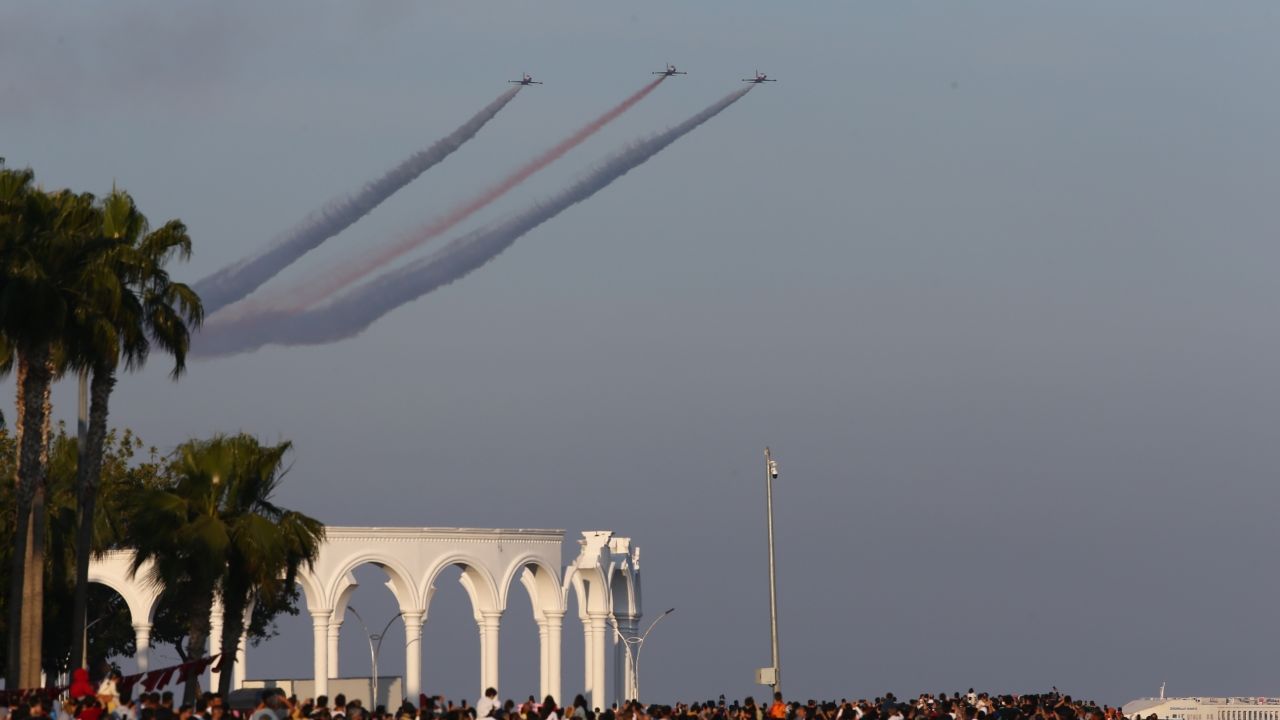 Adana'daki İncirlik Üssü'nden havalanan Türk Yıldızları'nın yaptığı gösteri uçuşunu sahil şeridindeki Mersin İdman Yurdu Meydanı'na gelen vatandaşlar ilgiyle izledi.