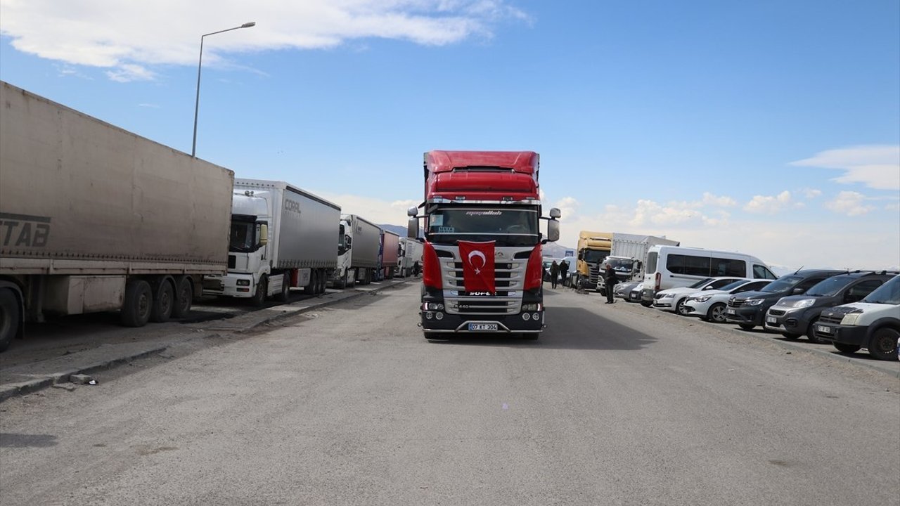 Van'dan yola çıkan tıbbi yardım malzemeleri yüklü 6 tır, Doğubayazıt ilçesine geldi.