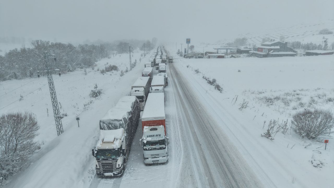 Öte yandan bölgede yolun açılmasını bekleyen tırlar, dronla görüntülendi.