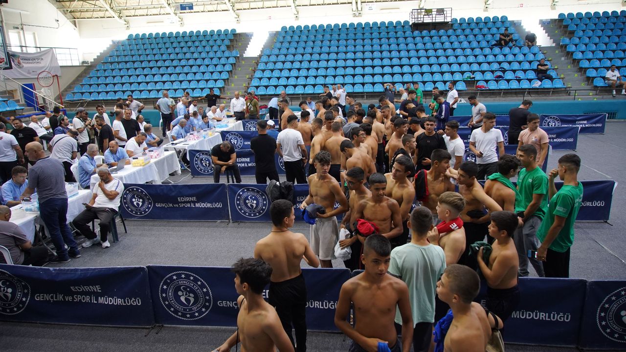 Farklı boylardaki pehlivanlar, Mimar Sinan Spor Salonu'nda oluşturulan platformlarda kayıtlarını yaptırıyor.