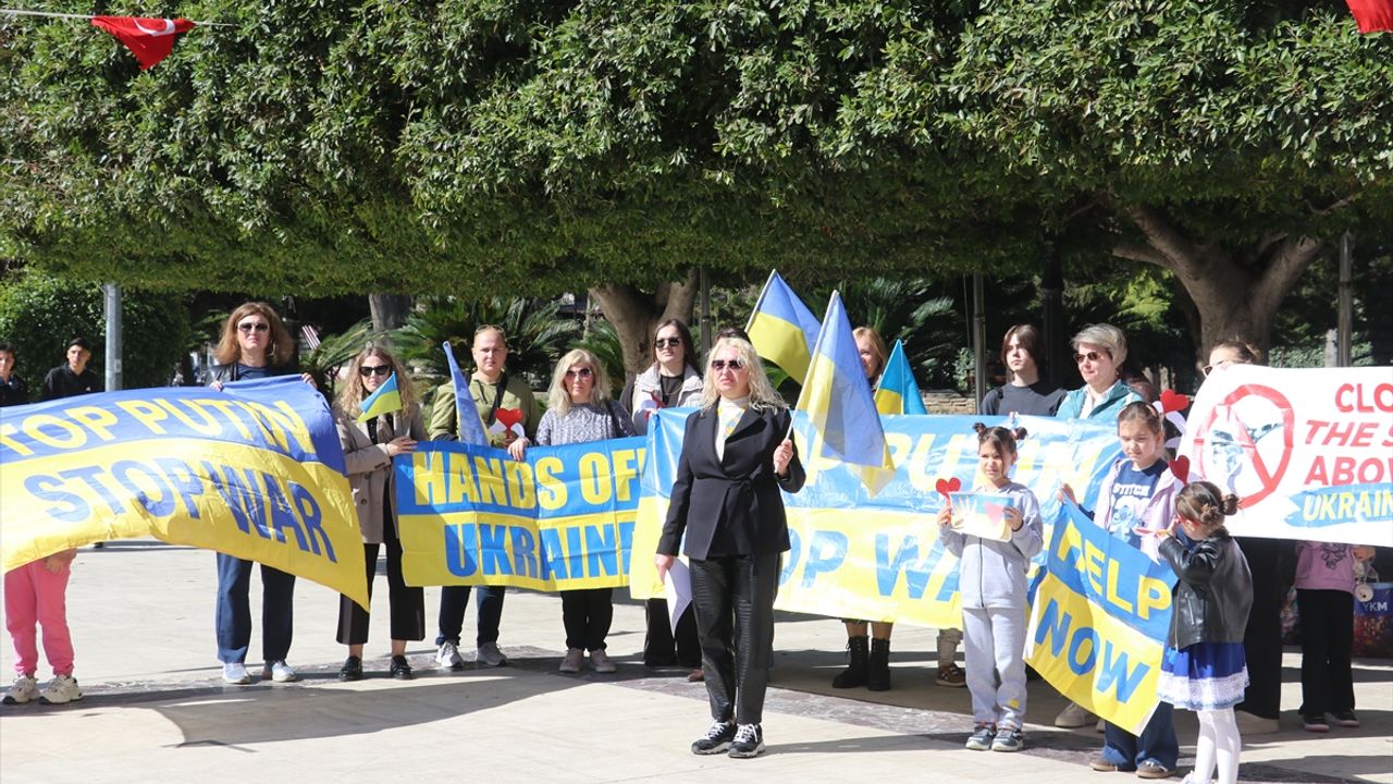 Etkinlikte katılımcılar, Ukrayna bayrakları ile İngilizce 'Putin'i durdur, savaşı durdur' ve 'Ukrayna'dan ellerinizi çekin' yazılı pankartlar taşıdı.