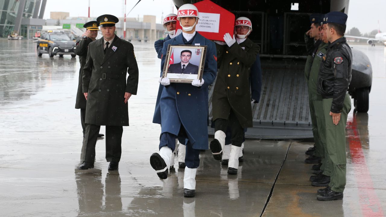 Yakınları ve yetkililer tarafından karşılanan şehidin Türk bayrağına sarılı tabutu, silah arkadaşlarının omuzlarında cenaze aracına taşındı.