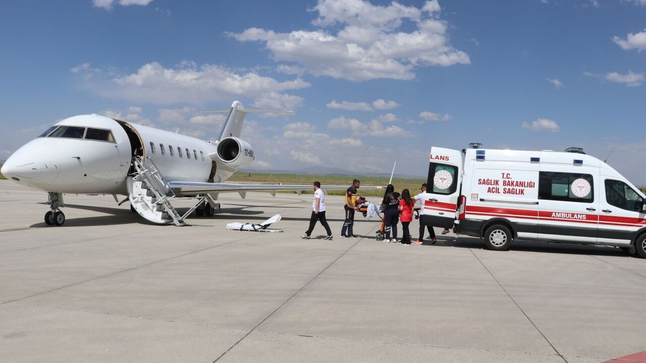 112 Acil Sağlık ekiplerince ambulansla Ahmed-i Hani Havalimanı'na getirilen çocuk, Sağlık Bakanlığına ait ambulans uçakla Ankara'ya nakledildi.