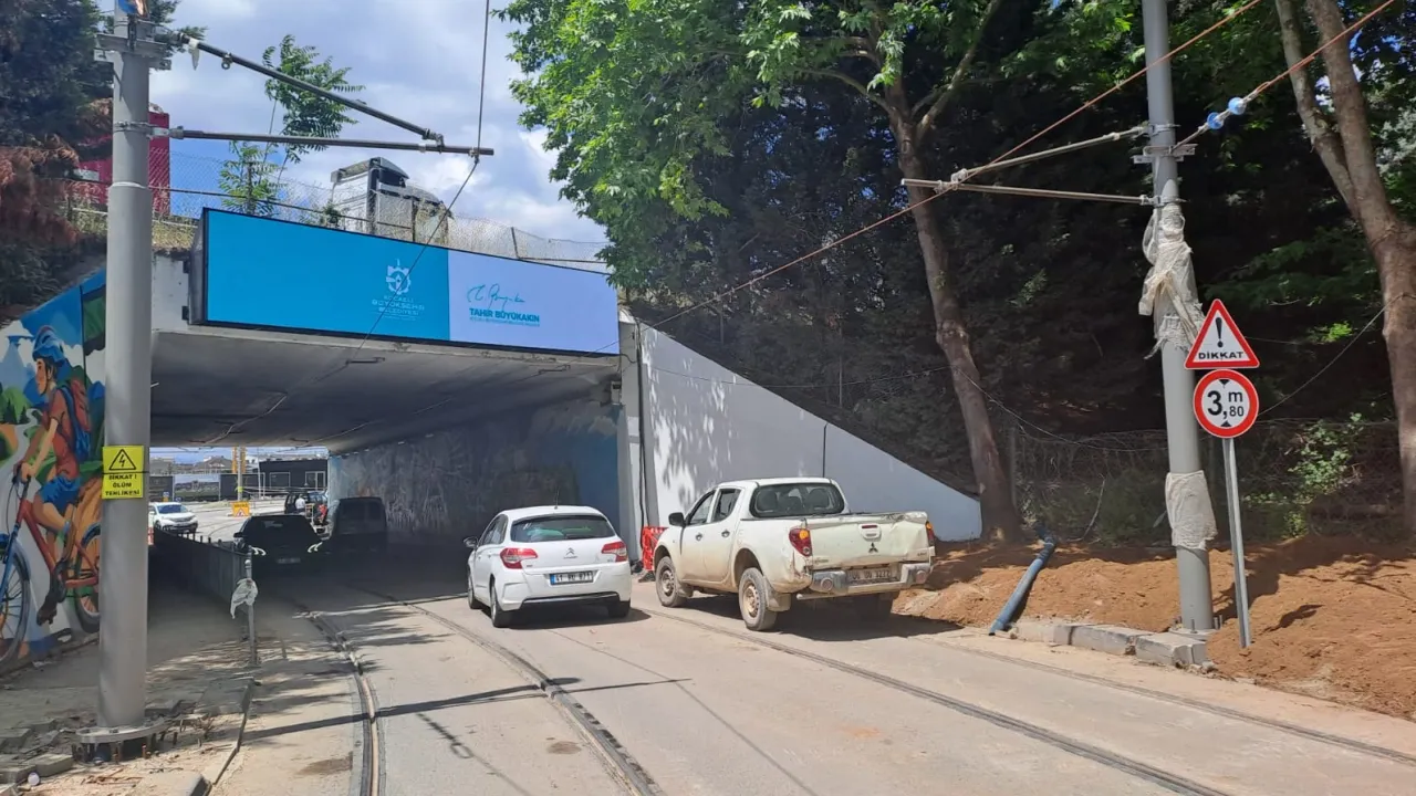 Kocaeli Büyükşehir Belediyesi, “Alikahya Stadyum Tramvay Hattı Projesi” kapsamında trafiğe kapattığı Anadolu Otoyolu altındaki menfezi yeniden trafiğe açtı. Tramvay hattına ait rayların döşendiği Anadolu Otoyolu altındaki menfezde, yüksek araç sürücülerinin alternatif güzergâhları kullanmaları zorunlu olacak. Bu kapsamda menfez giriş ve çıkışlarında sürücülerin dikkatini çekmek için “Yükseklik Sınırı: 3,80 m”, “Ağır Tonajlı Araç Girişi Yasaktır” ve “Alternatif Rota Kullanınız” uyarı levhaları yerleştirildi.