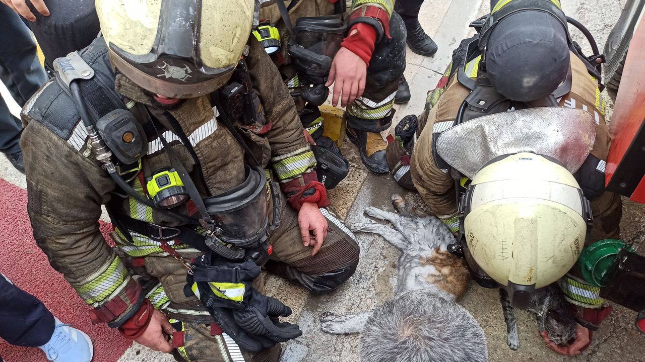 Dumandan etkilenen Paytak ve Şanslı isimli kedilere sağlık ekipleri kalp masajı yaptı, oksijen vererek hayata döndürdü.