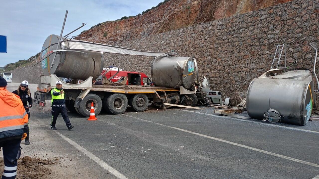 Şükrü E. yönetimindeki 10 P 6512 plakalı süt tankeri, Balıkesir-Edremit kara yolu Balya Kavşağı'nda refüje ardından istinat duvarına çarptı.