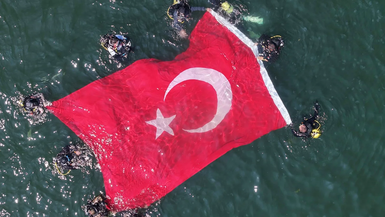 Daha sonra dalgıçlar su altındaki dev Türk Bayrağı’nı çıkararak protokolü selamladı.