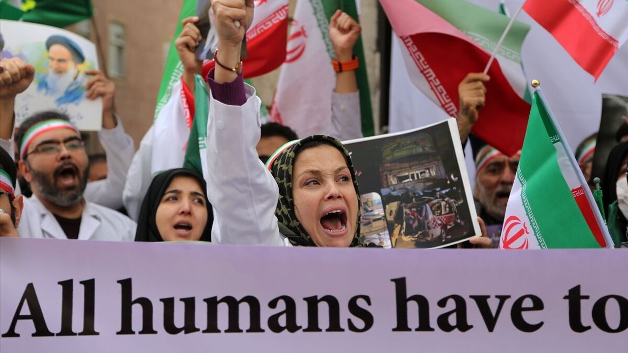 Protestolar sırasında, 'İsrail'e ölüm, ABD'ye ölüm, İngiltere'ye ölüm' sloganları atılırken, protestolara katılanların ellerinde, ABD ve İsrail'in Minab'taki okula yönelik saldırısında hayatını kaybeden çocukların resimleri yer aldı.