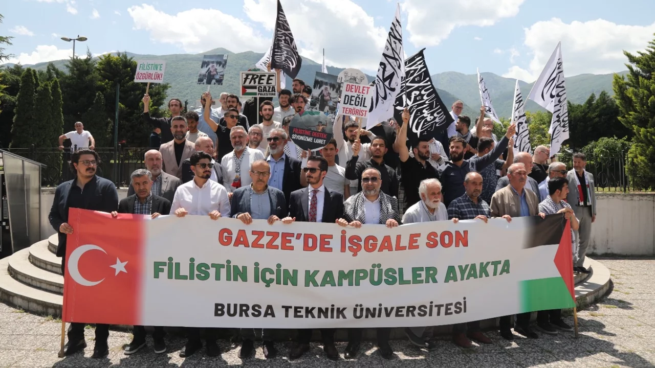 Bu arada Gazze'de açlık, ambargo ve bombalarla yok edilmek istenenin, yalnızca bir şehir değil; bir halkın hafızası, direnişi, inancı ve onuru olduğunu vurgulayan Enes Burak Demirci, katliama sessiz kalmayarak, zulme uğrayan masum kardeşlerin yanında saf tuttuklarını söyledi. "İşte bu bilinçle, bizler Bursa Teknik üniversitesi öğrencileri olarak; Filistin halkının onurlu direnişini destekliyoruz" diyen Demirci, "İsrail’in sistematik soykırımını ve işgalini lanetliyoruz. Tüm vicdanlı insanları ve özellikle üniversiteleri, İsrail’i destekleyen markaları ve kurumları boykot etmeye çağırıyoruz. İnsanlık onuru için, özgür Filistin için ayağa kalkıyoruz. Kampüsler özgürlük ve direnisin kaleleri olmalıdır. Buradan ilan ediyoruz: Filistin, Gazze, kampüsler yalnız değildir” diye konuştu.