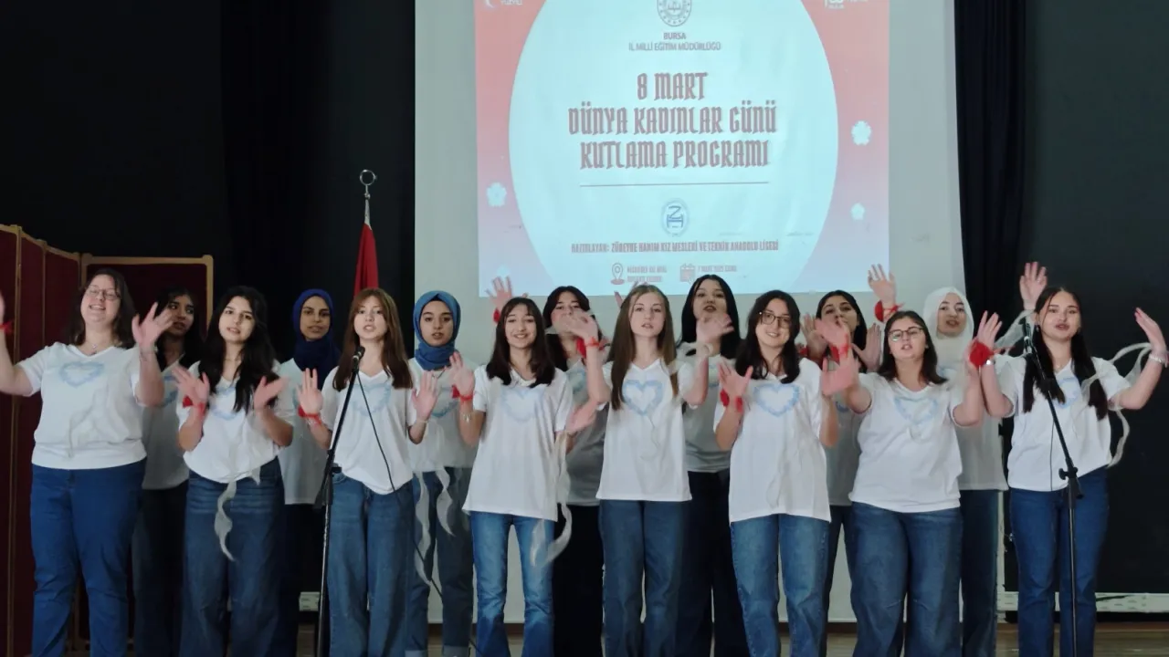 Bursa İl Milli Eğitim Müdürlüğü 8 Mart Dünya Kadınlar Günü Kutlama Programı, Zübeyde Hanım Kız Mesleki ve Teknik Anadolu Lisesi öğrencileri tarafından gerçekleştirildi.BURSA (İGFA) - 8 Mart Dünya Kadınlar Günü öncesindeki liseli öğrencilerin etkinliğine Bursa İl Millî Eğitim Müdürü Dr. Ahmet Alireisoğlu, il ve ilçe millî eğitim müdürlüğü yöneticileri, öğretmenler ve öğrenciler katıldı.